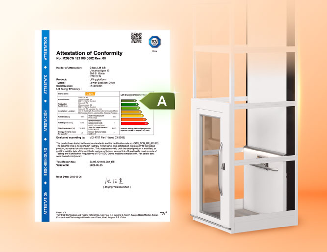 Thang máy Cibes sàn nâng với hệ truyền động EcoSilent Drive được TÜV SÜD chứng nhận đạt nhãn năng lượng A ở chế độ chờ, theo tiêu chuẩn châu Âu VDI 4707, áp dụng cho nhóm sử dụng Nhóm 1 (sử dụng trong nhà ở, tần suất sử dụng phù hợp với gia đình).