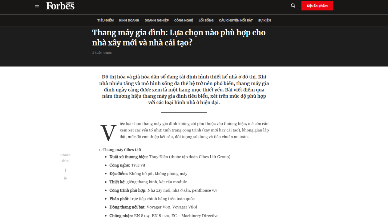 Bài báo trên Forbes đề cập đến Cibes như một giải pháp thang máy gia đình phù hợp cho cả nhà cải tạo và nhà xây mới, với khả năng lắp đặt nhanh chóng và linh hoạt.