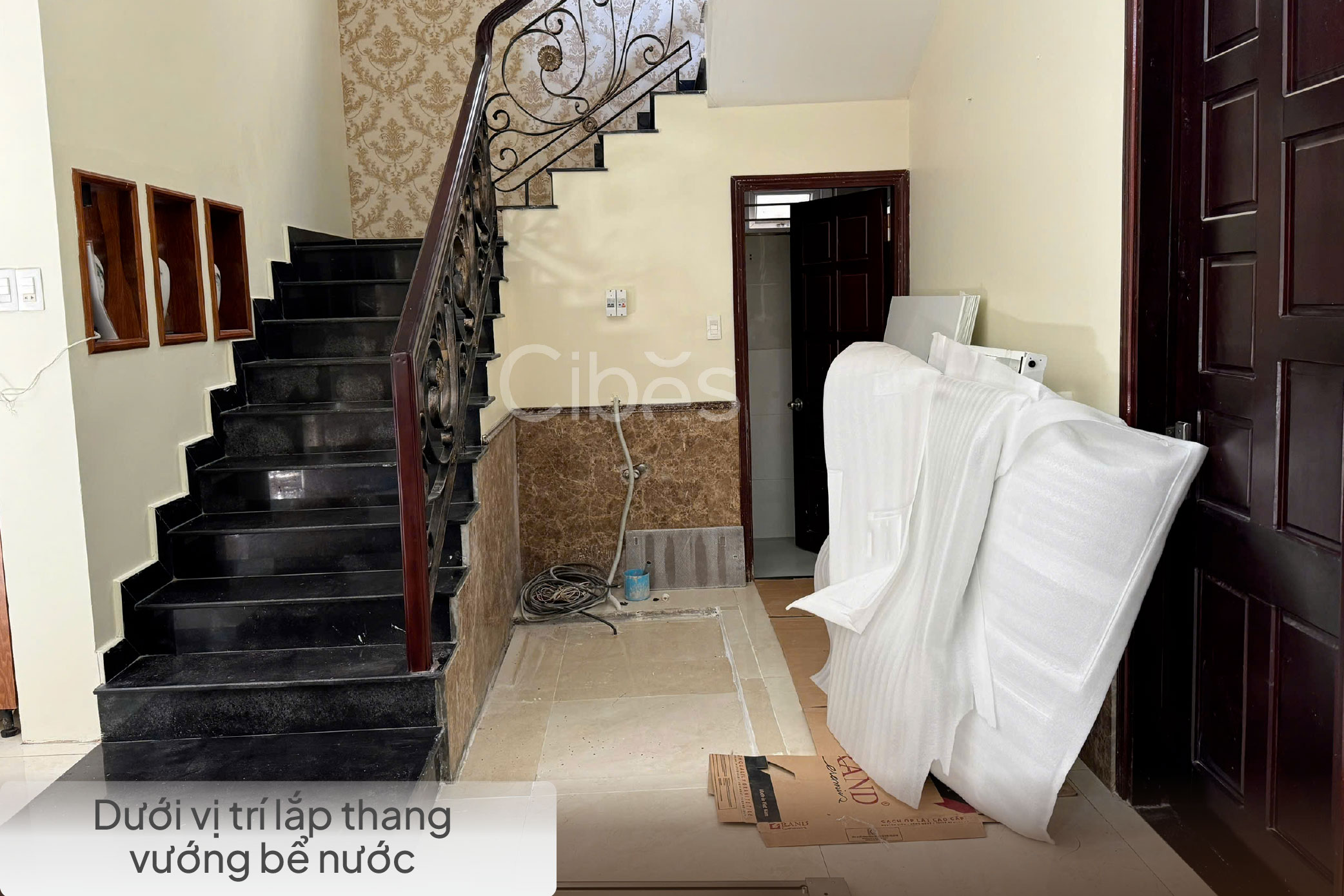 Có khoảng thông tầng để lắp thang nhưng bê dưới lại vướng bể nước, bể phốt v.v