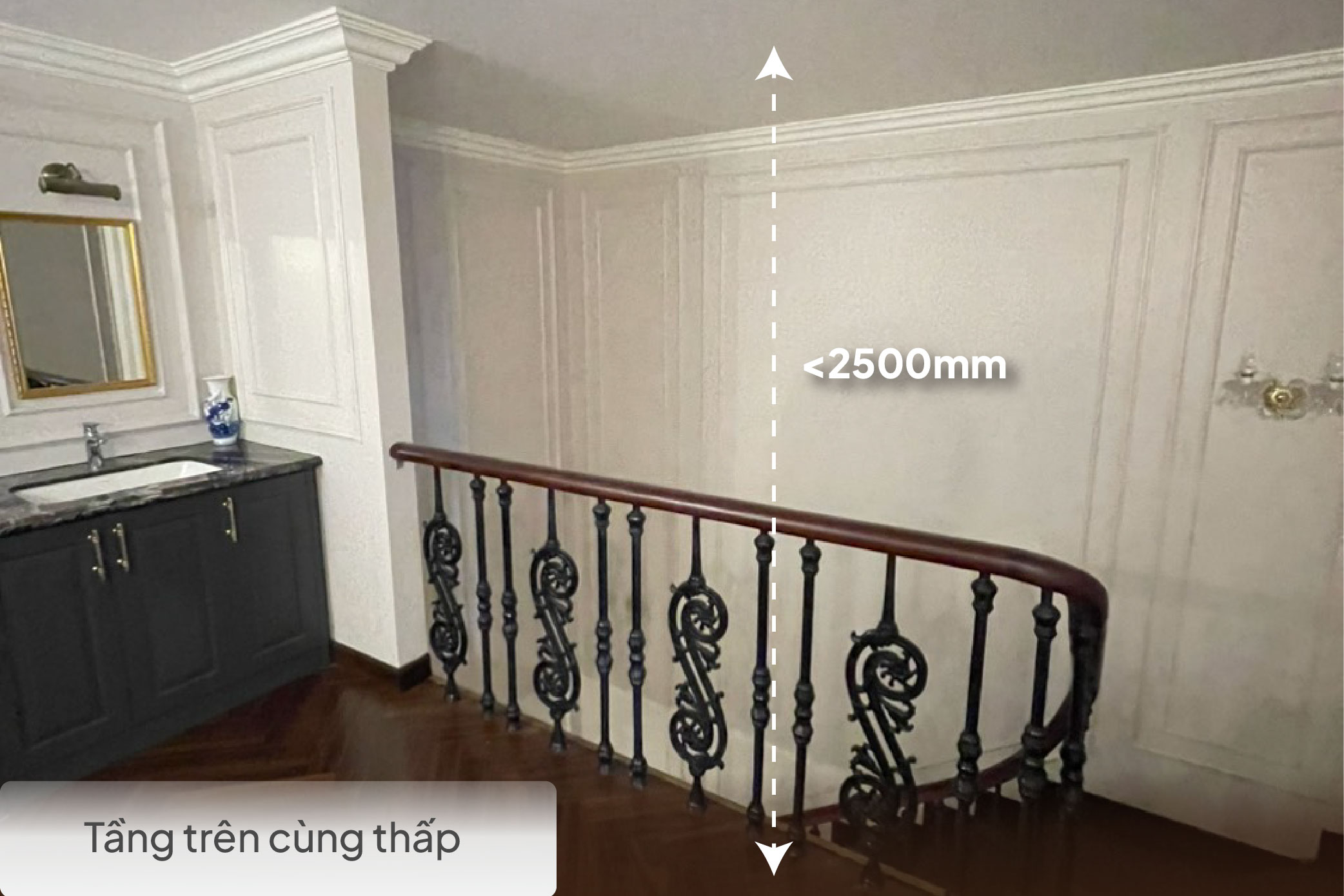 Các tầng dưới có chiều cao đủ để lắp thang máy, riêng tầng trên cùng có chiều cao thấp hơn (<2500mm), không đủ để lắp thang máy lên tận nơi.