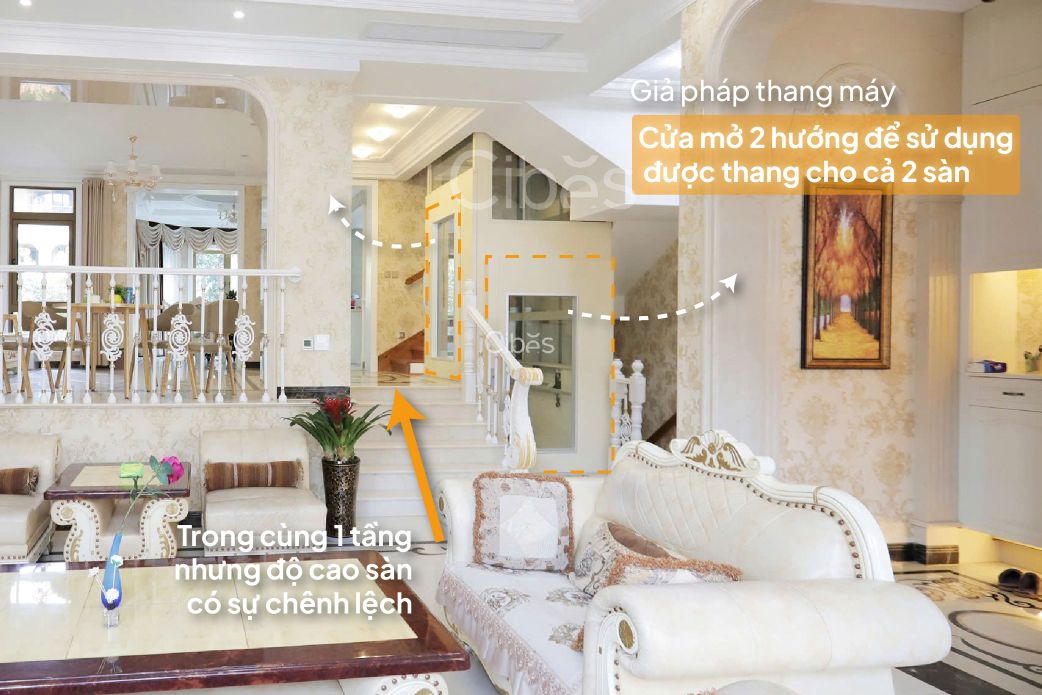 • Giải pháp của Cibes: Thang máy Cibes lắp đặt thẳng trên nền nhà và làm dốc bước vào, hoàn toàn không cần làm hố pit. Kích thước thang vừa vặn giữa thang bộ, không cần cải tạo.